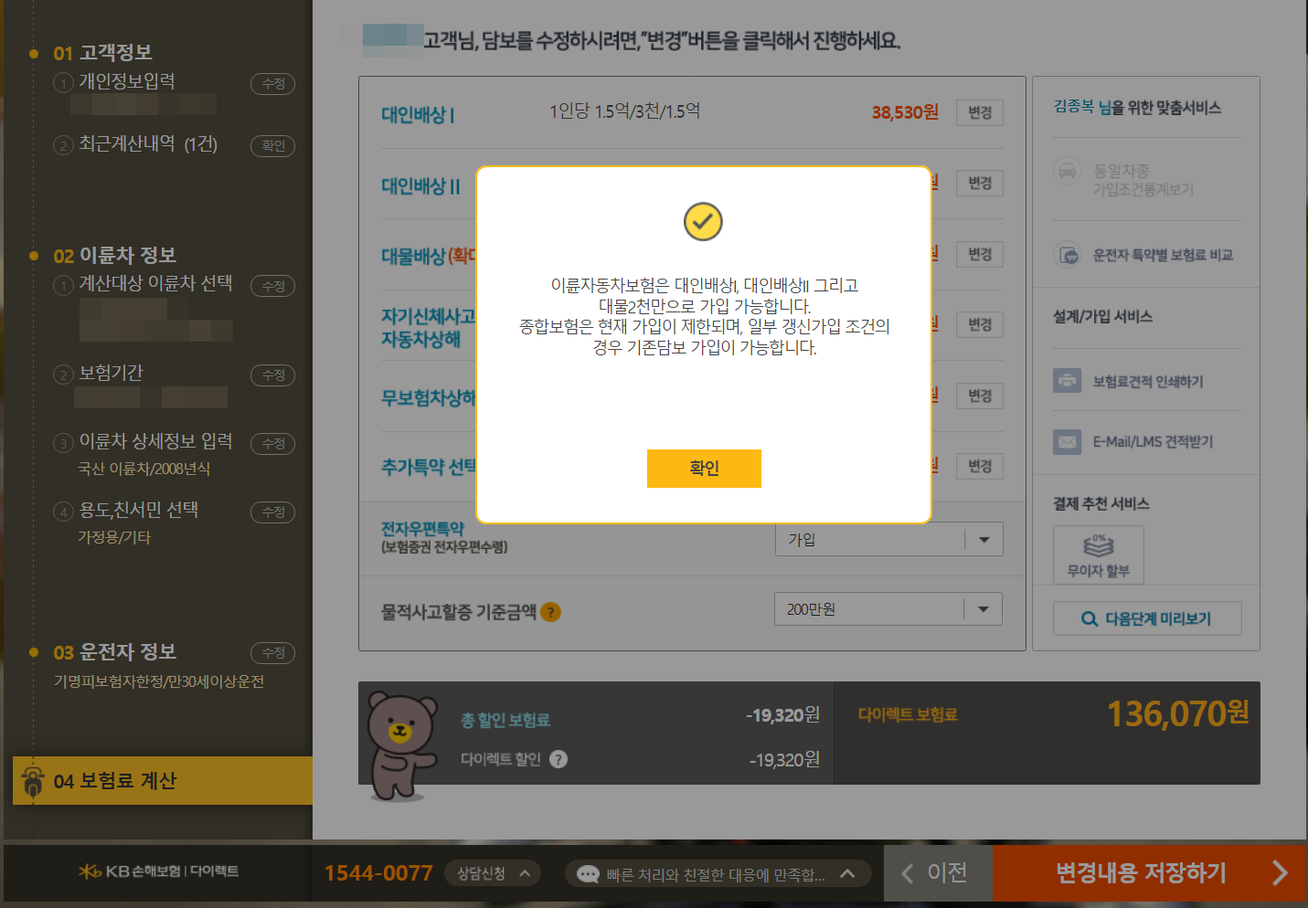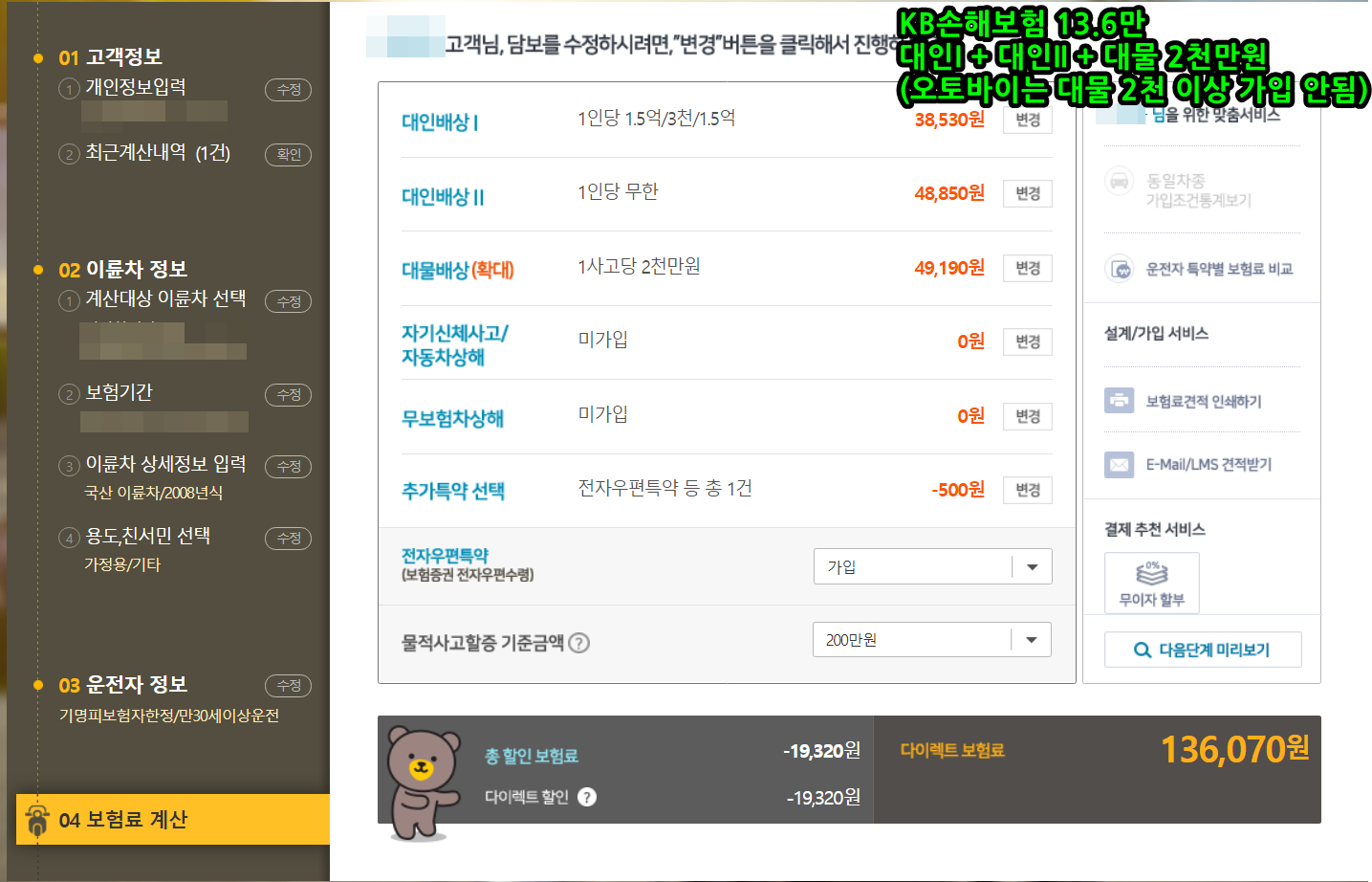 (3) KB손해보험 다이렉트 13.6만원 (특이사항으로 대물 2천만원 이상 가입이 안됩니다.)