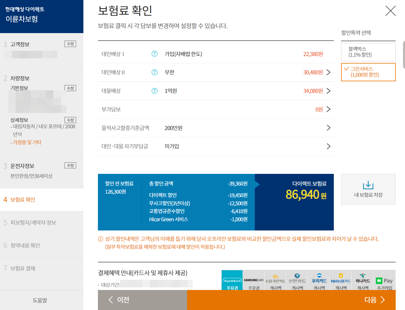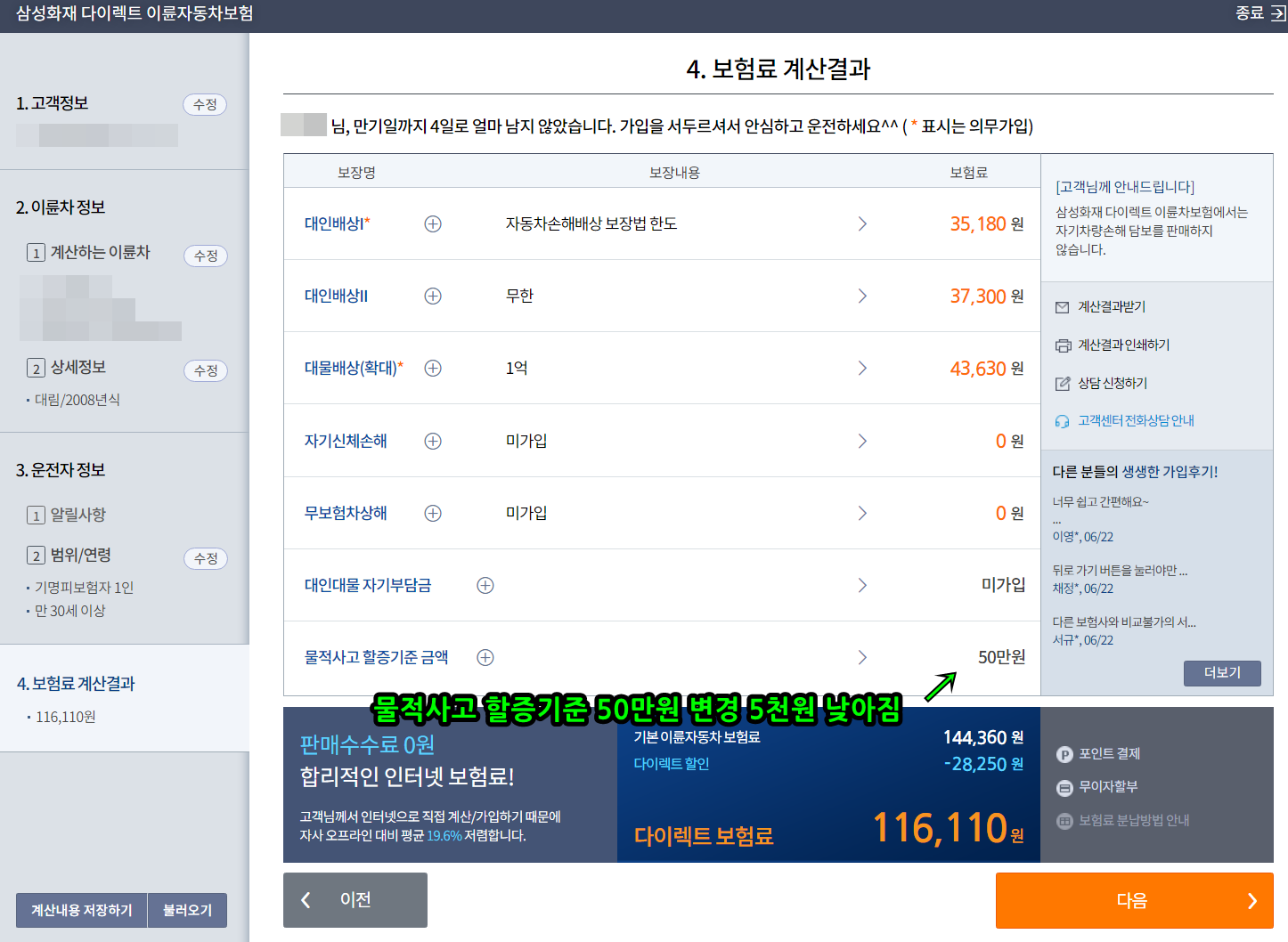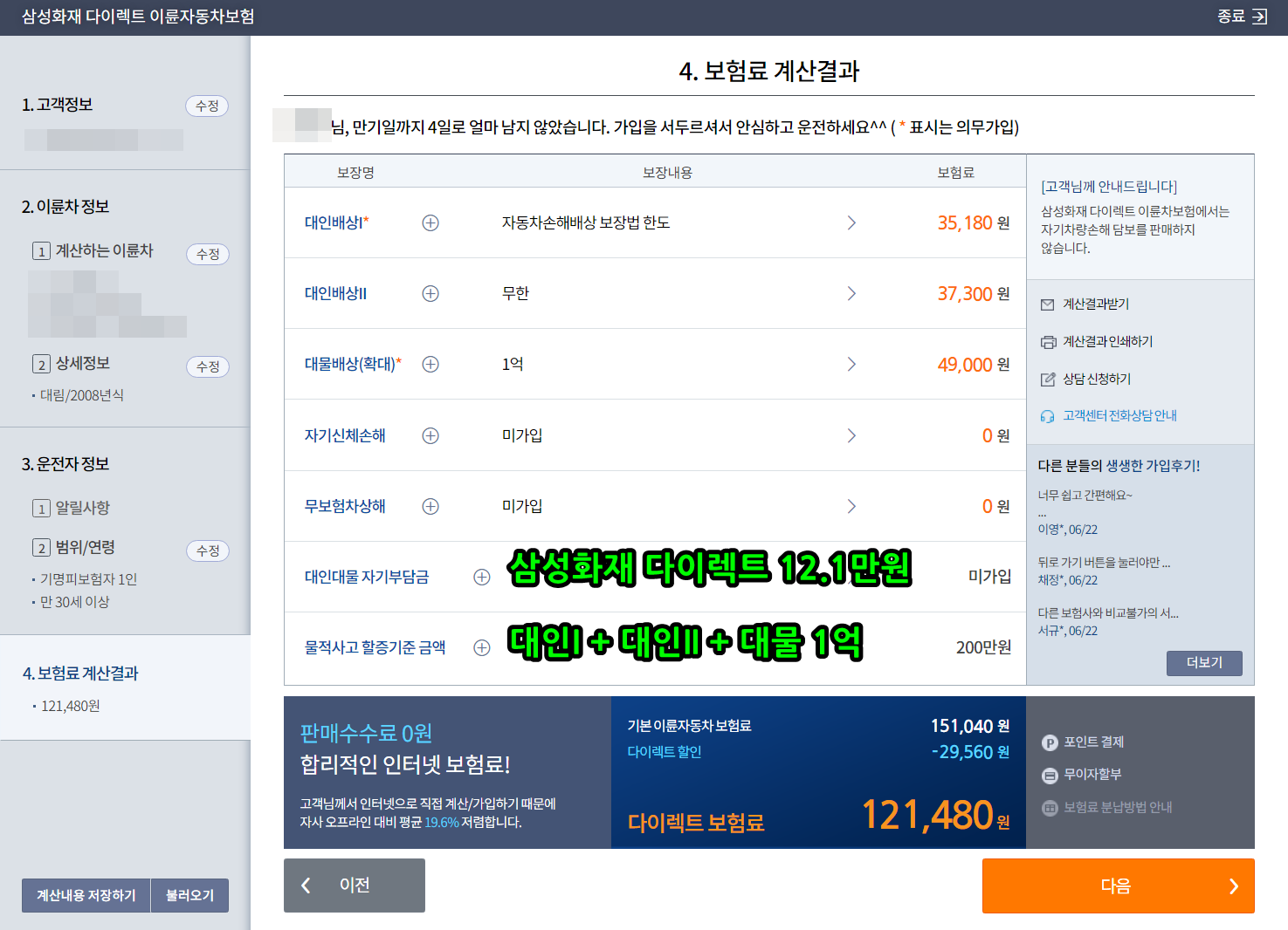 (배달이 성행하기 전에는 삼성다이렉트가 항상 저렴했었는데, 배달이 많아지고 보험료가 많이 오르고 있는 거 같습니다.)