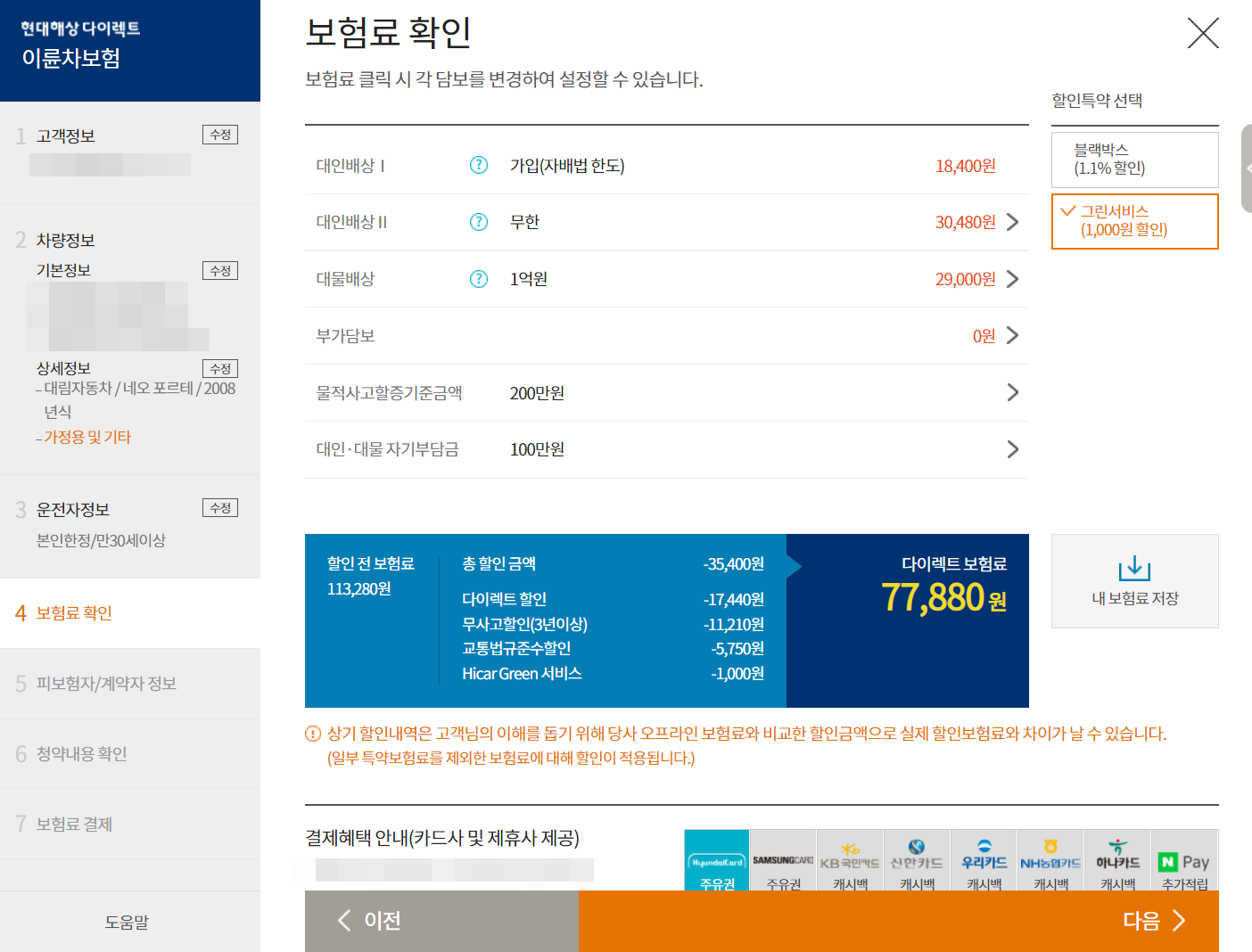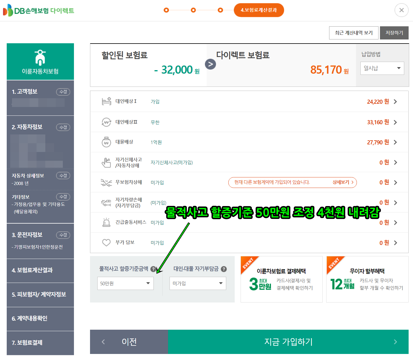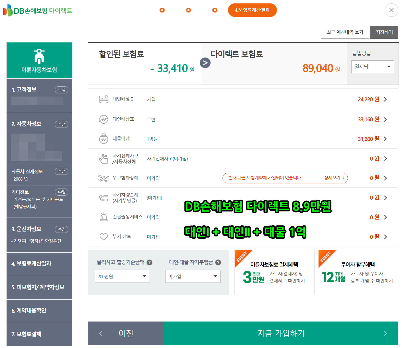 DB 동부화재랑 크게 차이나진 않지만 같은 조건이고 몇 천원이라도 싼 곳에 가입했습니다. 대인-대물 자기부담금 100만원 선택하면 보험료가 1만원 정도 더 저렴하게 가입할 수 있네요. 저는 사고시 자기부담금 없이 86,940원으로 가입했습니다.